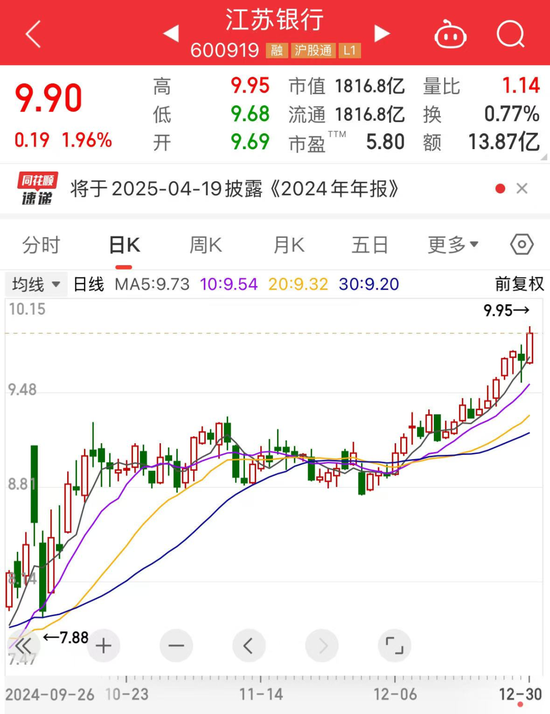 以江苏银行为例,该股今日上涨1.96%,最新收盘价创历史新高,最新A股市值突破1800亿元。该公司主要业务集中于经济发达、金融资源丰富的江苏省,辐射全国三大经济圈,是江苏省最大的法人银行。